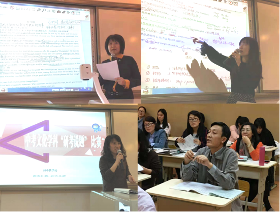 为了提高教师研题水平和解题讲题技巧,初中部教学处在2018年11月28日举办了“中考文化学科研考说题比赛”。我们初英组全体老师积极响应,在暑假已经认真完成了刚刚结束了2018年英语中考真题,并且对每道题的出题意图、考点以及解题技巧进行了详尽的分析。开学后,我们三个备课组都认真讨论近三年的中考题,预测明年中考出题的趋势。为了这次比赛,我们初英组在比赛前一周做出了最后的冲刺。教研组长王佳琼老师打印了近三年的真题及其详解给到参加比赛的老师,各备课组长在备课组会组织老师们讨论如何解说不同题型的题目。各组员还为彼此提供近三年的中考年报英语卷的解释。总之,无论是参加的选手,还是可能会在赛场上临时被抽到的选手,都为这次比赛做好了充分的准备。