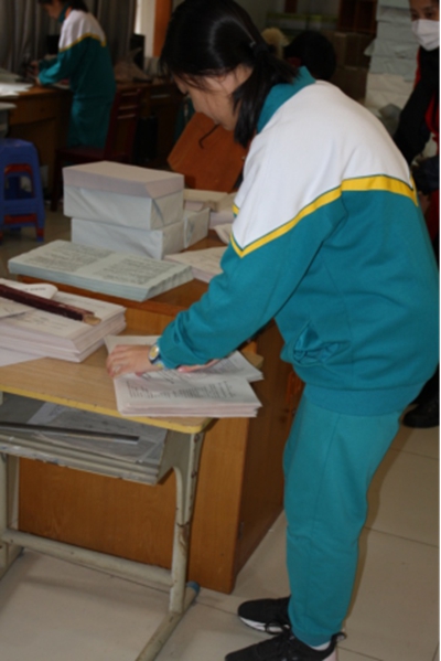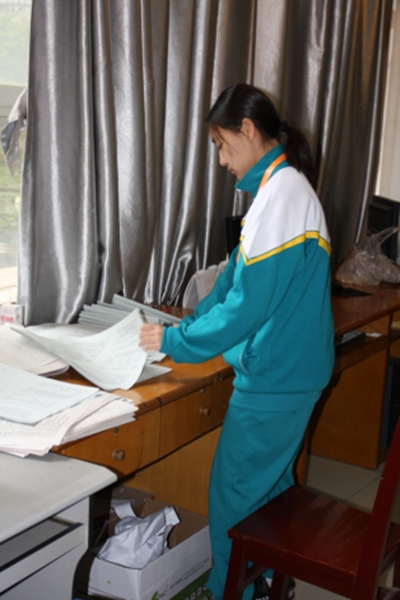 周裔汭、宋知乐同学的工作地点是文印室,她们刚好赶上月考,一整天的工作已经让她们疲惫不堪。各个年级的老师包括外教都和她们交流,合作。数了一千多张试卷,用订书机重复着同样的工作。以下是她们的工作心得:自己的耐心得到了锻炼,也很佩服文印室工作人员的坚持,细心为学校服务。知识的丰富,能力的拓展是这次社会实践最大的收获。