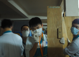 内心有些恐惧,但大家没有一个叫苦的。戴上手套和口罩,清尘除土,开始了一下午的建材平移。大家使出浑身的干劲。抬背、挪、移、叠、码……一个个弄得汗水淋漓,灰尘满面。中途小休时,孙同学索性拿了一块木板,当场打起碟来,自称DJ.JoJo,炒热气氛。