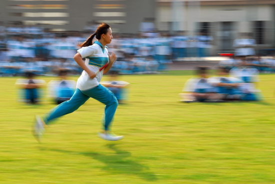 军训会操上,一位同学阳光自信的走过主席台。