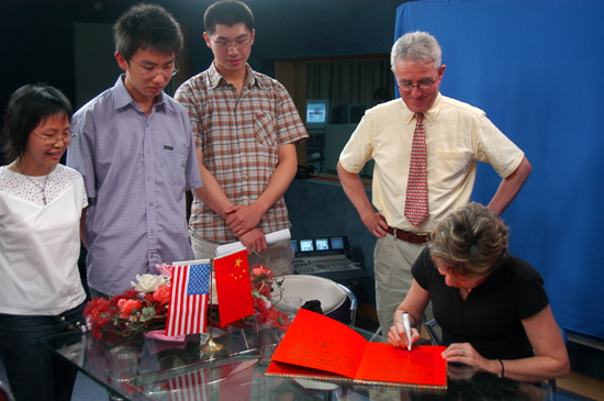 美国客人在电视台录制节目之后为主持人留言纪念。了解西方文化不一定要跨越千山万水,这样的机会在这个校园里很多很多。