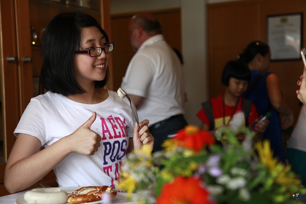 在市长招待午宴上,品尝着当地特色美味——白肠,陈子珊同学竖起了大拇指。
