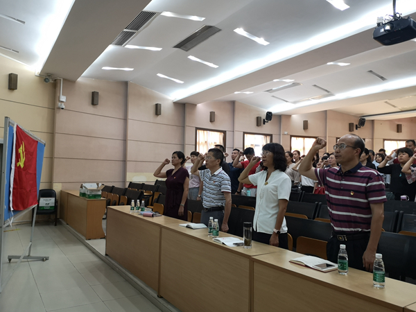 本次主题教育工作会安排了全体党员重温入党誓词的环节。“我志愿加入中国共产党……”,面对鲜红的党旗,我校全体党员同志,庄严宣誓,伴随着入党誓词,把我们重新带回了激情燃烧的岁月。