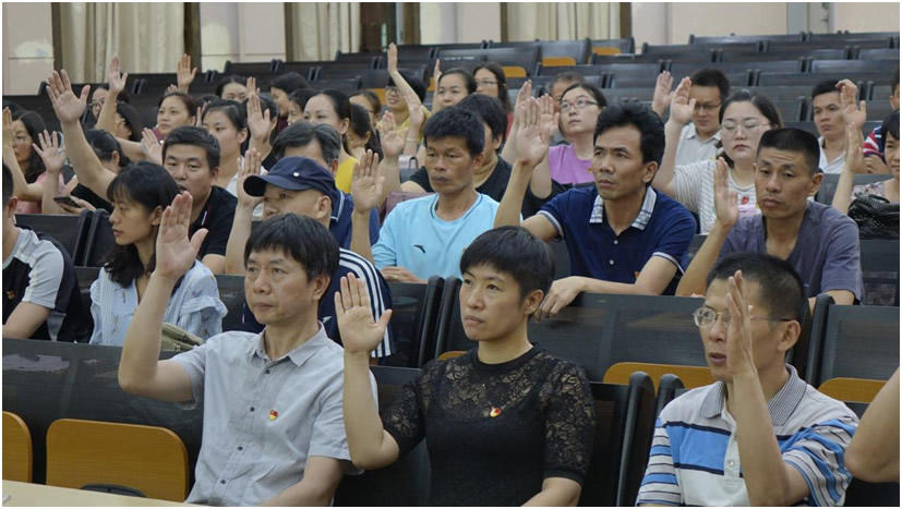 7月4日晚,学校总支部委员会换届选举大会在中学阶梯课室召开。学校正式党员、预备党员及流动党员共73人参加了会议。会议由总支部副书记李小萍主持。
