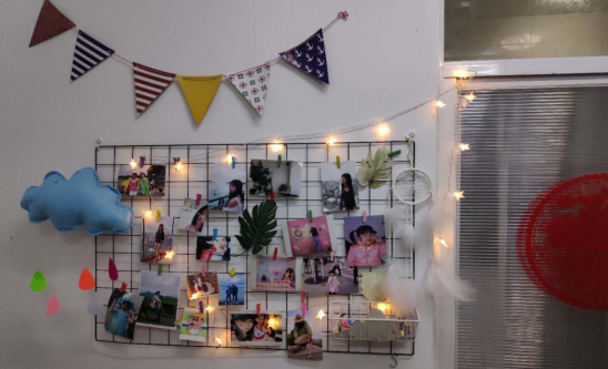 比如说,将自己小时候的照片和现在的照片贴上去进行对比。时光似梭,白驹过隙,不知在看到儿时笑得天真无邪的照片时,还是否能记得那最单纯的信念?现在与过去,被存于照片中,挂在墙上,也挂在每一个人的心上。旁边点缀着的装饰物背后,如众星拱月,为这美好的回忆修饰花边,将这份可贵的礼物,包装成独一无二的馈赠。