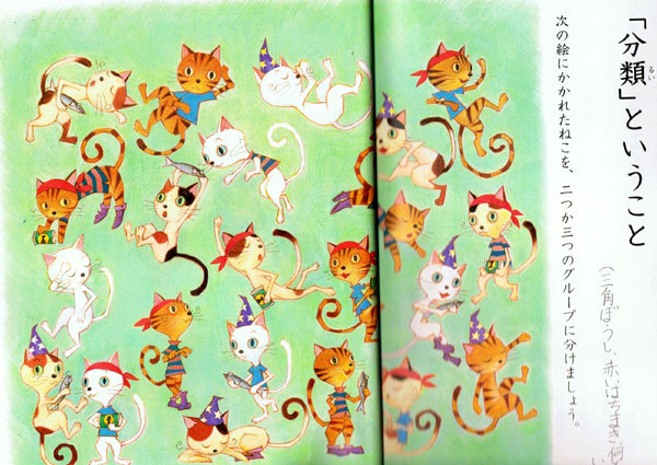 翻开“分类”这篇课文的第一页,首先是一个大标题“关于分类”,然后标题旁边是幅占满页面三分之二的大图画,这幅图画里画了许多猫,图画旁边写了一句话:“看看这幅画里的猫,然后分类为二个或三个小组吧。”