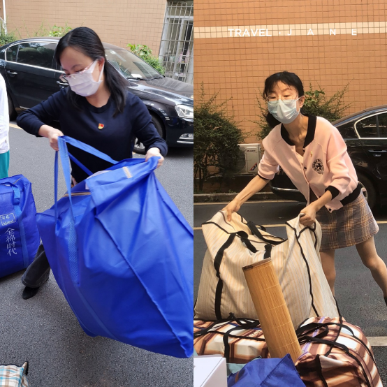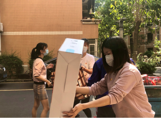 行李堆上“后勤保障车”,分送到男女生宿舍楼。正在楼前等待的党员们麻利的上前,开始卸货。