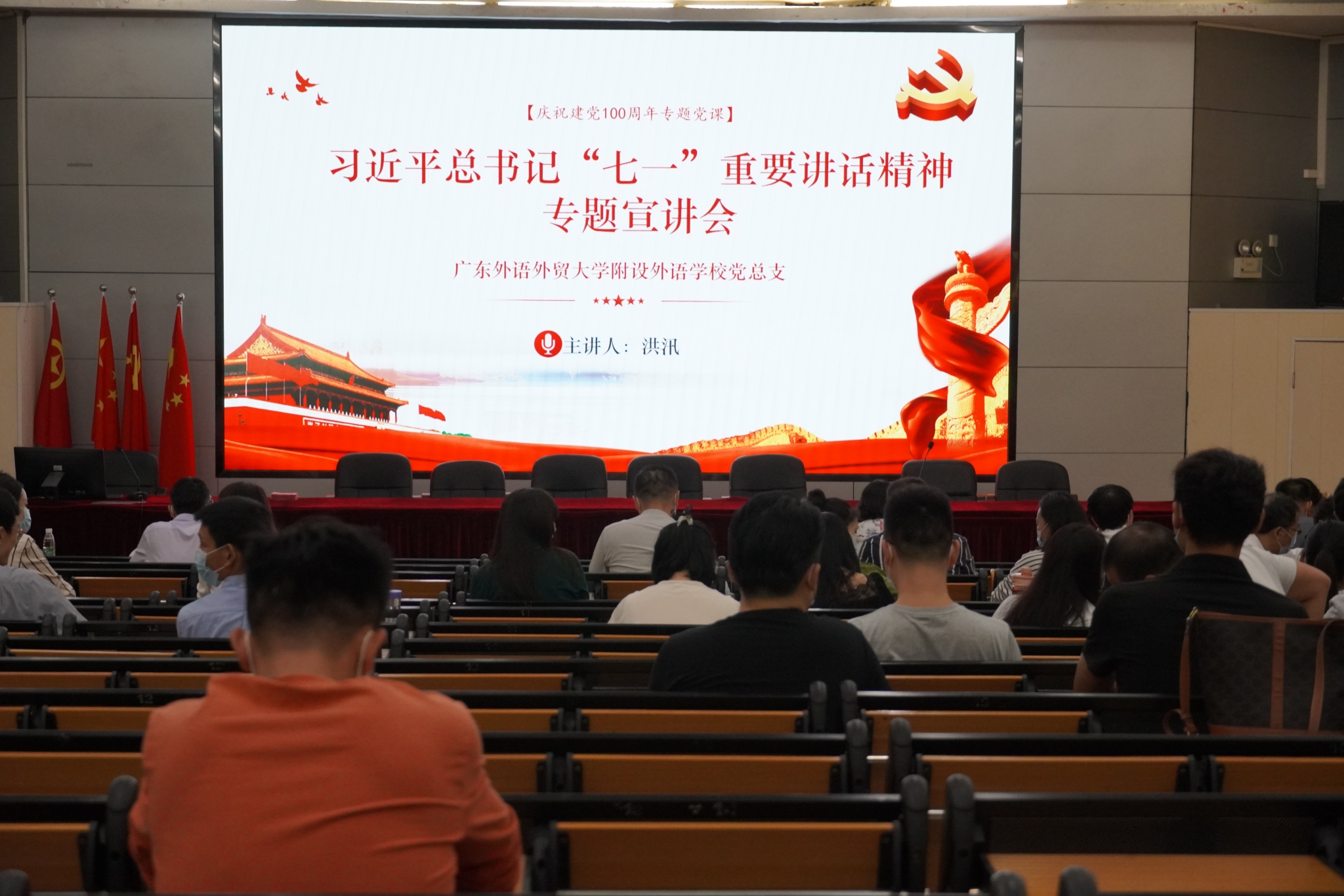 本网讯 10月13日晚,学校党总支在中学阶梯课室召开了党史学习专题辅导报告会,特邀广东外语外贸大学“百年党史”学习教育宣讲团成员、马克思主义学院洪汛老师、法学博士主讲。学校全体党员、入党积极分子参加了报告会。