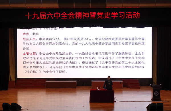 为深入学习贯彻党的十九届六中全会精神,巩固党史学习教育成果,12月7日,我校举办“十九届六中全会精神暨党史学习”宣讲会。广东外语外贸大学马克思主义学院副院长郑亚伟走进我校,为全校教师做了一场主题鲜明、内容翔实的宣讲报告。