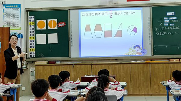 朱丽兰老师的《分数的初步认识》中,从整数到分数是数概念的一次扩展,无论在意义上还是读写方法上,分数和整数都有很大的差别,朱老师根据学生的年龄特点和学习起点,为学生营造有趣的“秘密基地”,通过自主探究、合作交流、感悟分数的含义、直观比较分数的大小等,帮助学生掌握概念、理解概念。通过这节课可以感受到朱老师不是在教教材,而是跳出教材,站在教改的新理念的高度上驾驭教材,设计中力求体现新课程强调的体验性学习,感受数轴上的数越接近0,分数越小。不仅让学生用脑子去想,而且要用眼睛去看,用耳朵听,嘴说话,用手操作,用心灵去感悟、体验分数的意义及大小。“你看到了什么?”“我们是怎么表示半圆的?”“1表示什么?2呢?”“你会读吗?”“二分之一表示什么意思?”“你猜下一副图是什么?”……朱老师以建构理念为依托,充分发挥学生的潜能,让学生主动建构属于他们自己的知识和对事物的理解。有了扎实的双基,才带来拓展练习中意外的惊喜。在最后一道拓展题中,学生都能迎刃而解。