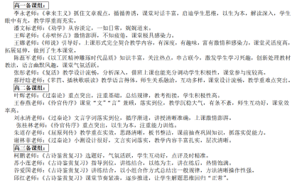 邱红老师首先分年级、分课型历数各位老师的上课亮点,肯定在课堂教学上做出的不懈努力和取得的优异成果。基于此,她总评高效乐学课堂范式的特色:现代文新授课循循善诱,启迪学生思维,上课形式契合教学内容,课堂对话和活动丰富,有深度,有趣味,富有激情和感染力;文言文新授课“文”“言”兼顾,注重基础,总结规律,重视能力训练,教考衔接,循序渐进,落实到位;复习课选题务求精当,师生互动充分,点评及时,讲练结合,总结出一般规律,方法清晰,操作性强,让学生解题思维回归“正常”,练好过硬本领。