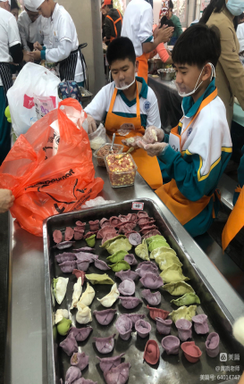 评委席上评委们认真地观看孩子们的展示、演讲,不时给孩子们点头微笑和掌声。小组介绍环节结束就开始包饺子展示真功夫了。