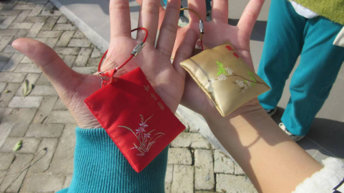做完以后,陈导又带我们去做了香囊,各式各样的香囊料挑的同学们眼花缭乱,但最终,大家都做出了独属于自己的一个香囊。香囊放在阳光下,传出来的淡淡的香味,正是我们青春的一次印记。