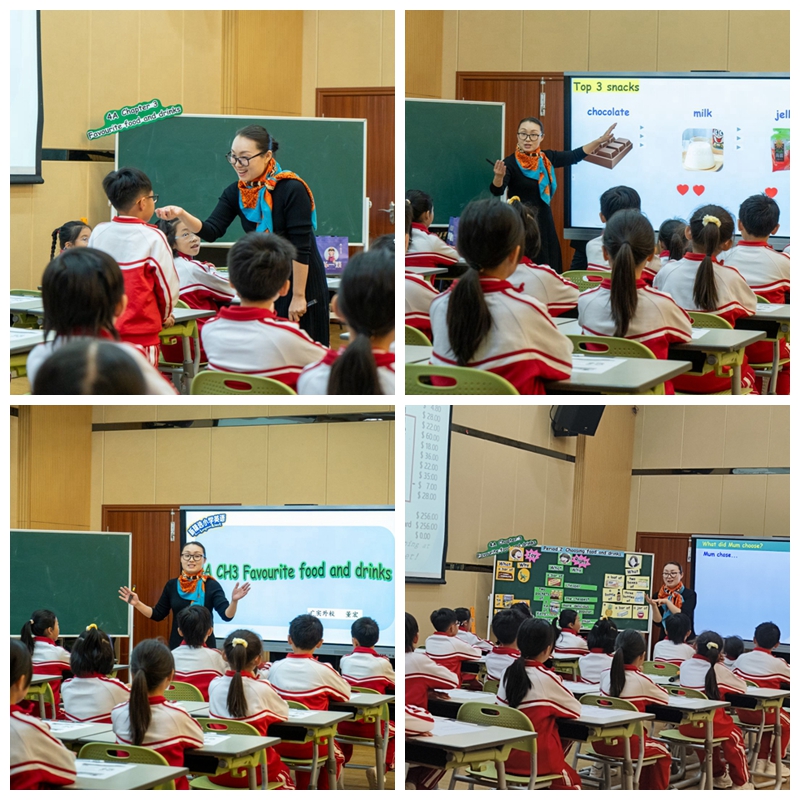 本次展示活动的重头戏是每个小组的展示课,董宏老师代表周英主任带领的第四小组进行教学成果展示,上课的内容是《新精选小学英语》4A Chapter 3 Favorite food and drinks第二课时,本课时话题为Choosing food and drinks。董宏老师课堂充分展示了她扎实专业的教学功底与教育智慧,她用完美的表现震撼全场的各位专家与老师。