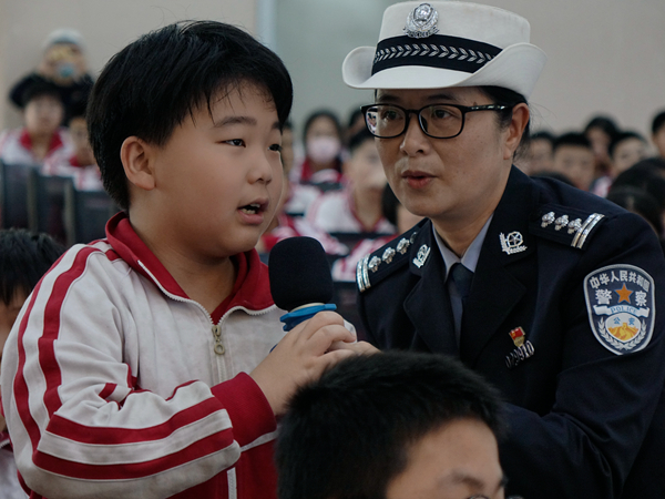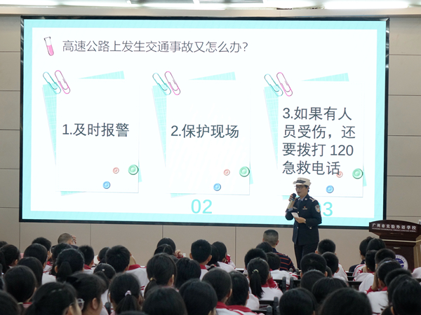 交警还向同学们普及了酒驾、醉驾的危害和成本,希望同学们能够以“小手拉大手”模式传递给家长,从而提升整个社会的道路交通安全意识。台下同学纷纷踊跃举手,与交警欢乐互动。