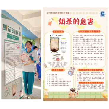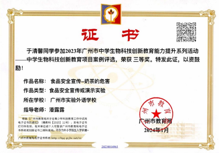近日,我校初一(11)班于清馨同学以“奶茶的危害”这个作品参加了广州市教育局关于举办2023年广州市中学生物科技创新能力提升系列活动,并获三等奖(指导老师:潘露露)。