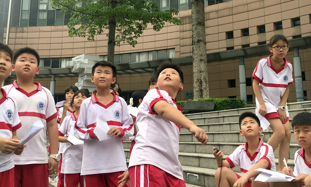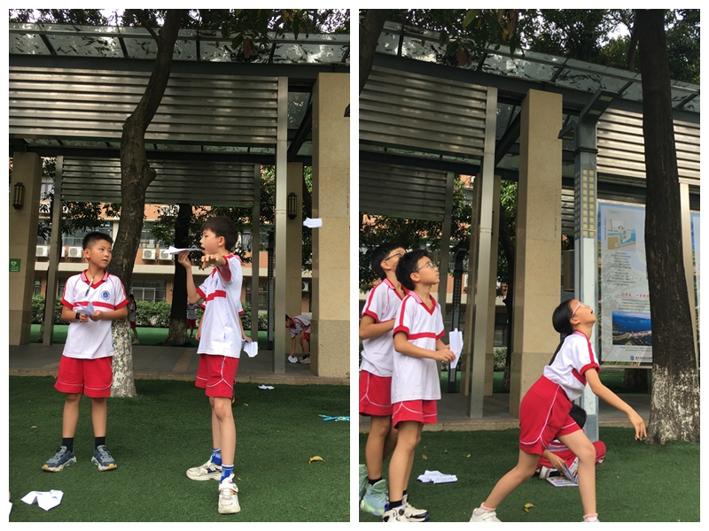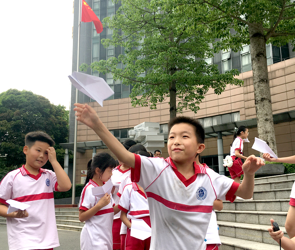 活动前,科学老师首先给同学们布置好任务,让同学们回家练习纸飞机的制作,探究什么样的纸飞机滞空时间长?活动中,孩子们首先在课堂上按照自己的探究,折叠出形状各异的纸飞机,然后外出放飞。你可以看到,在黄华楼礼堂前,在假草坪上,都有孩子们放飞纸飞机的身影。这时的孩子们,忘却了一切,满眼都是纸飞机,活动中,到处都是欢声笑语,到处都是追逐“飞机”的身影。古人所描述的“儿童散学归来早,忙趁东风放纸鸢”,大概就是这个景象吧。有的同学纸飞机10多秒以上,兴高采烈,有的同学的纸飞机一出手就落下了地,但也没有表现沮丧,当场就在旁边改进,再飞行再改进……最终成功飞向“蓝天 ”。