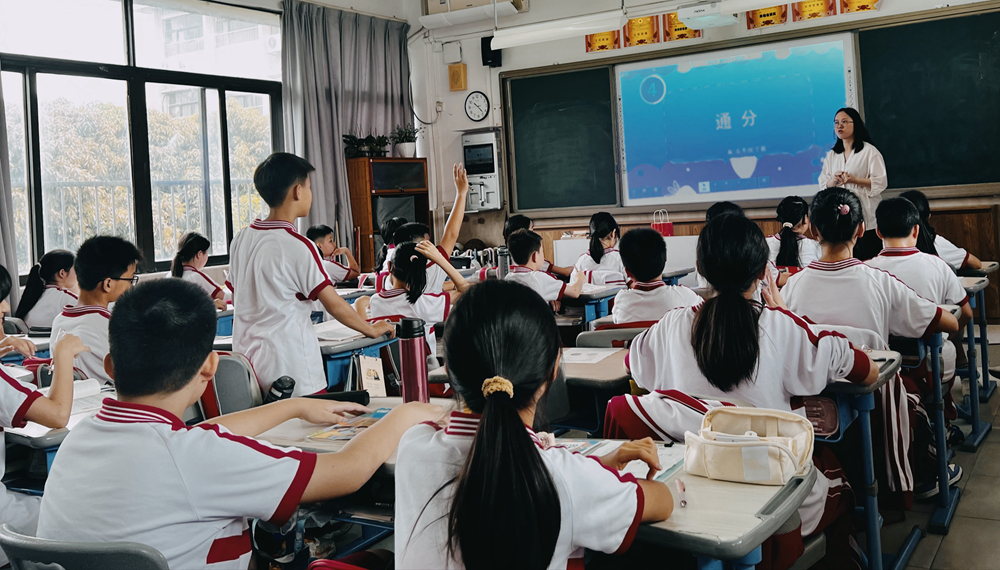 其中陆老师在教学《通分》时,由于考虑到学生已经掌握了分数的基本性质和求最小公倍数的知识,所以在授课时,更多的是运用旧知的迁移,引导学生通过观察、分析、合作等数学活动,自主探索和解决问题。教学中陆老师还设置了具体的情境,让学生在实际问题中体会通分的作用,并通过小组合作、转化等教学方法,激发学生的学习兴趣和自主探究的精神。帮助学生在掌握方法的基础上,不断提高学生运用多种策略解决问题的能力,促进学生对通分意义的深化理解。