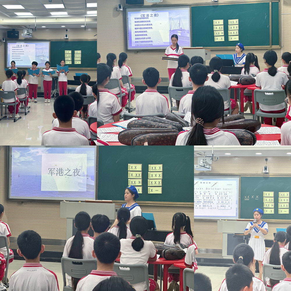 王老师本节音乐课的课题为《军港之夜》,这是一首中国军旅歌曲中海军经典代表曲目,王老师通过观看视频、聆听、演唱、演奏等多种实践活动,带领学生们深入感受这首歌曲所传达的宁静深沉的音乐情绪。