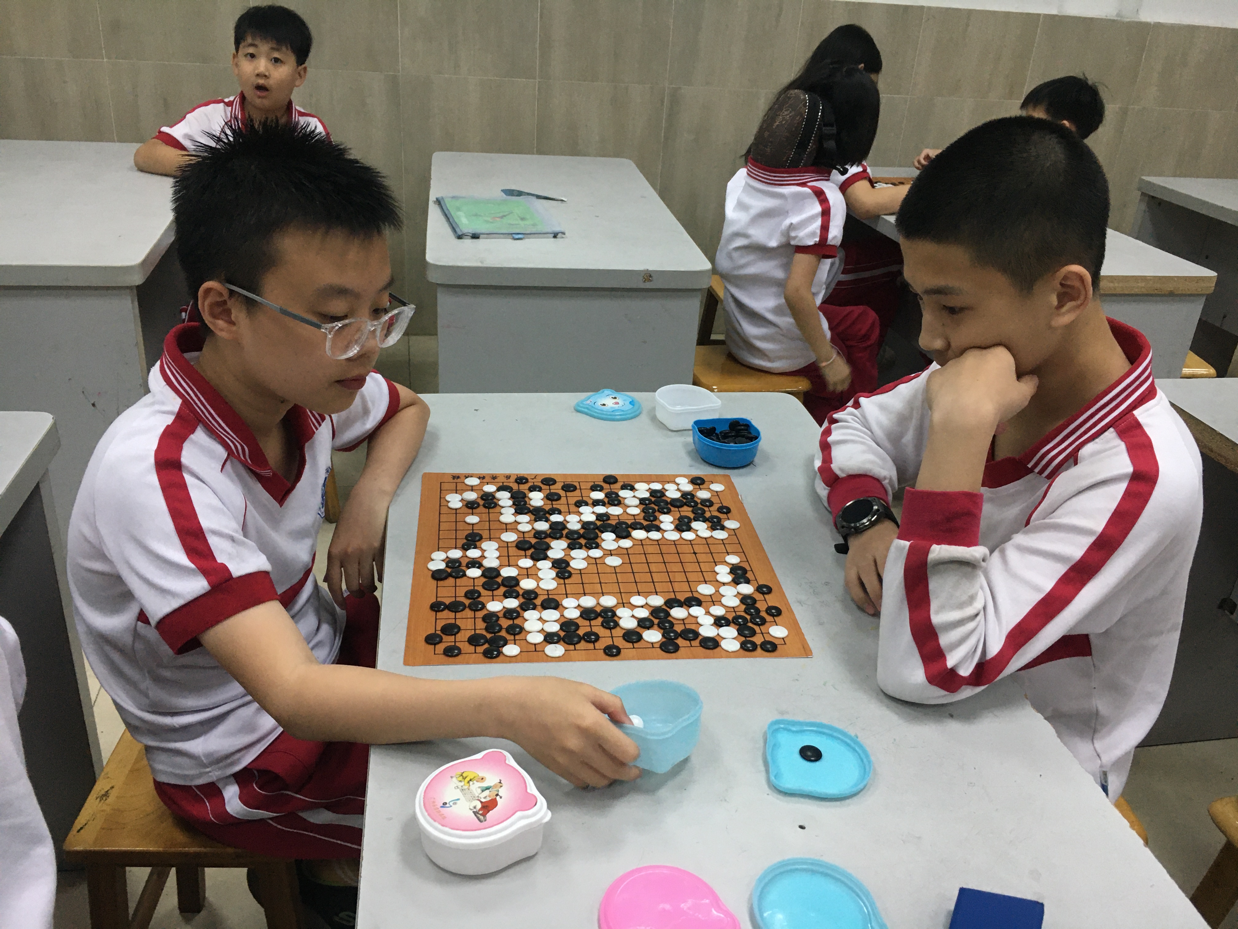 我校今年是第一次组队参赛,10名选手经过校内选拔、集训,组成两支队伍,分别参加了小学甲组和小学乙组组别的比赛。赛场上,参赛小棋手们一个个沉着冷静、 机智应对,沉浸在黑白对弈的乐趣中。面对一个个对手,展现出高超的棋艺水平和良好的心理素质,赛出了风格,赛出了水平,充分展现了广实外校的精神风貌。经过激烈的角逐 ,精彩博弈,在近90支参赛队伍中,我校小学甲组获得团体第9名,小学乙组获得团体第11名。其中四(8)班的陈璐瑶同学以六轮全胜的战绩获小学女子个人第二名(和第一名同分,净胜分略少2分),五(6)班的邓牧言同学以七战六胜的成绩获小学男子个人第三名。