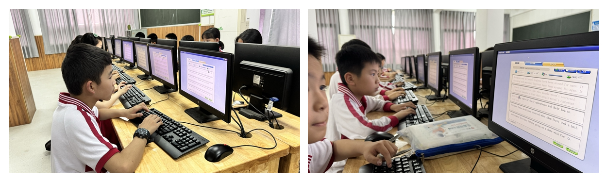 四年级打字比赛要求学生用自已熟悉的输入方法完成一篇规定文章的录入。根据学生所用的时间、打字速度和正确率综合评出名次。比赛一开始,小选手们以极其娴熟的指法敲起了键盘一只只小手在键盘上飞舞,令人眼花缭乱,目不暇接。一时间寂静的教室里被噼里啪啦的声音所笼罩,选手们完全置身其中,忘记了自我。