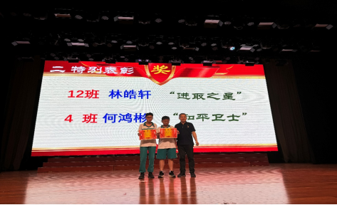 12班的林皓轩同学近段时间虽然右手受伤,但学习毅力惊人,尝试着用左手完成作业,没有欠交过一次作业,所以被授予“进取之星”荣誉称号。4班何鸿彬同学协助处理同学小摩擦的过程中,非常真诚且有耐心,所以被授予“和平卫士”的荣誉称号。