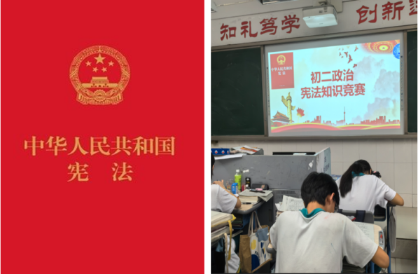 宪法是国家的根本法,是治国安邦的总章程,具有最高的法律地位、法律权威、法律效力。它规定了国家的根本制度和根本任务,明确了公民的基本权利与义务,是保障国家长治久安、人民幸福安康的坚实法治基础。初二道德与法治下册是宪法专册,为了大力弘扬宪法精神,全面深刻理解宪法的基本原则和精神,增强宪法意识、公民意识和民主法制意识,自觉维护宪法尊严。初二年级道德与法治学科分别组织了“宪法知识竞赛”和“宪法集体诵读活动”。