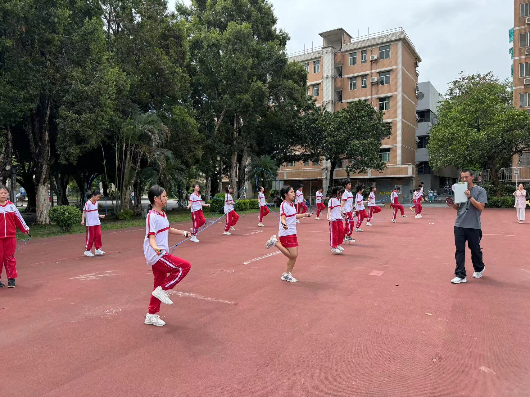 本次比赛是以班级为单位展开的,需要每一名同学的参与与努力。进行一分钟计时并记录每一名同学的跳绳成绩,最后根据班级所有同学累计成绩和参赛人数,计算出人均成绩。人均跳绳个数最多的班级为胜。随着比赛哨声的吹响,彩绳迅速飞舞起来,跳绳劈啪劈啪的拍击地面,清脆而激烈。虽然天气炎热,学生们仍然奋力拼搏,汗流浃背,互不相让。跳出自己最好水平,力求为班级取得更好的成绩。