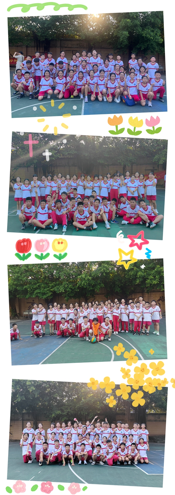 9月3日下午二课时间,小学篮球场上一片热闹非凡的景象。同学们身着火红的校服,脚踏轻快的步伐,脸上洋溢着对比赛的期待与自信,来到小学篮球场。全年级14个班,除了个别同学因身体不适之外,大部分班级全员参加了这次开学热身赛。各班同学安排好顺序,排列好队伍,每个同学脸上洋溢着欢快的笑脸,他们与同学互相击掌鼓劲,流露出那份对胜利的渴望和对班集体的热爱,在金色的阳光下熠熠生辉。