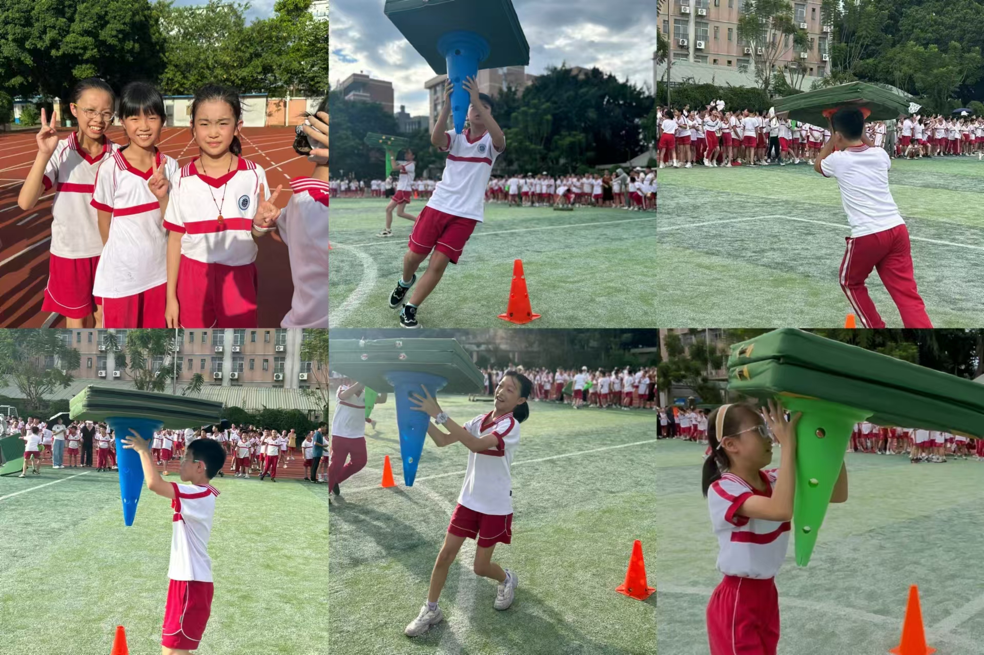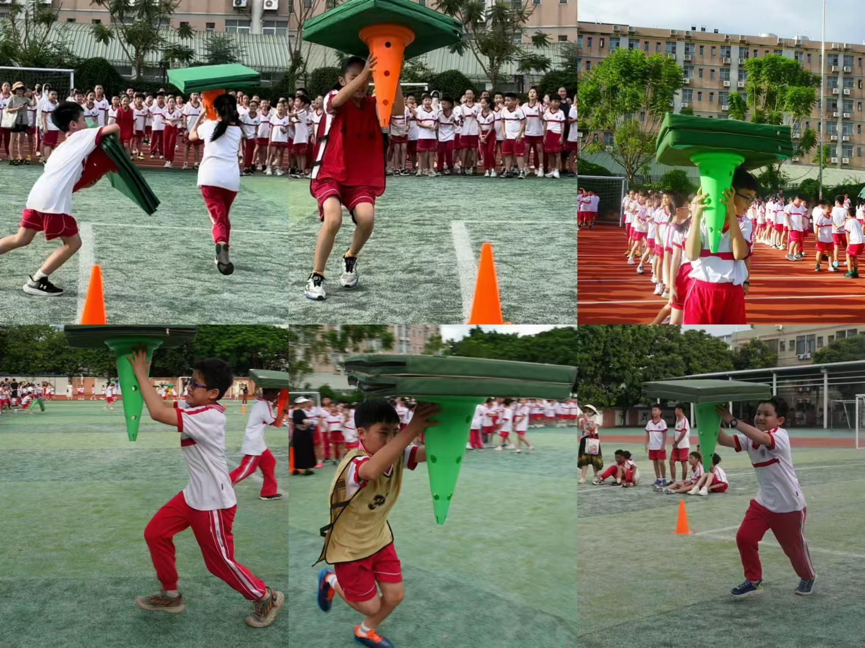看!场上英姿显自豪,健儿们双手用标志筒托举体操垫过头顶,脚下步伐在飞奔,绕标志杆返回,迅速交接给下一位同学。