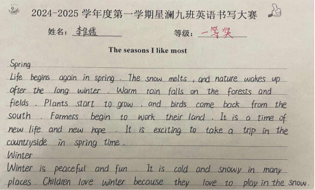 比赛现场气氛热烈又安静,同学们个个坐姿端正,神情专注。他们手中的笔仿佛有了魔力,在纸上流畅地勾勒出一个个规范、漂亮的英文字母。有的同学书写速度适中,确保每一笔都清晰有力;有的则先仔细斟酌布局,再精心书写内容。