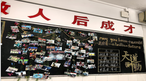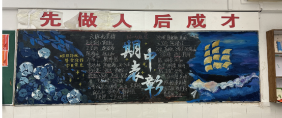 走进教室,映入眼帘的就是各班教室后绚丽多彩的黑板报。大多都以“期中考试总结”为主题,通过列出各类排名的方式警醒同学们奋发向上、勤奋学习,努力追寻自己的目标。图文并茂的黑板、盛放的花朵、飘扬的彩带、奔腾的海浪,还有象征吉祥的龙和仙鹤,无不展现着班级的精神文化。