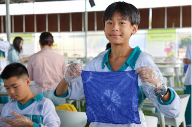 踏过石板,穿过树林,我们来到了第一站——拓染基地。在教师的指导下,同学们纷纷用橡皮筋在白手绢上扎出别致的形状。拿着自己的作品,往染水中一浸,待白手绢吸饱了水分,便将其取出,拧干。接下来,便是最激动人心的时刻——同学们用指尖轻轻捏住橡皮筋,一圈一圈将其拆下,原来叠在一起的部分便舒展开来,没扎的地方染上了青一色拓染水,扎住的地方则依然洁白,两者相交的地方颜色交织在一起,时而淡,时而深,宛若一幅素雅的中国画。不一会儿,独属于每个同学的艺术品便完成了。看着自己的作品,我们心中既是欣喜,又是激动。