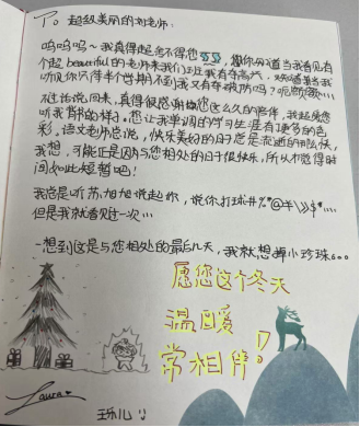 时光宛如湍急的溪流,潺潺不息,又如白驹过隙,一瞬千里。转瞬间,刘畅老师与我们共度的时光,即将画上句点。2024年12月12日,在这离别的当口,不舍如潮水般漫上心头,感恩似繁花在心底绽放,我们怀着复杂的心情,为刘老师举办这场意义非凡的欢送会。