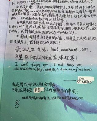 最后,刘老师走上台,泪水在眼眶里打转,刘老师用三个词概括了与我们的相遇。第一个词“感恩”——感谢林老师这段时间无微不至的关怀与帮助,让我能迅速适应这里。更感谢同学们,你们的纯真与热情,让我收获了满满的温暖与感动。第二个词“快乐”——我们一起走过足球比赛,校运会,合唱比赛,话剧比赛,黑板报比赛,还有无数个背书的瞬间,每个打球的放学,每一天都很开心。第三个词“成长”——实习过程中刘老师收获了书本学习不到的宝贵经验,我们共同经历了青春最美好的岁月。这段实习经历,是我人生中最宝贵的财富,我会永远铭记。当刘老师说到“天下没有不散的宴席”时,忍不住流泪,温暖的吴卓航同学迅速送上了纸巾。刘老师又说“人生何处不相逢,我们一定会再见!”同学们激动得鼓掌,纷纷和刘老师相约明年篮球赛相见。