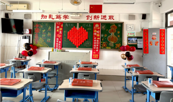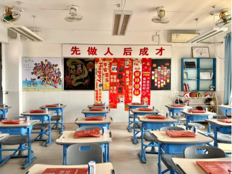 讲台前的墨绿⿊板化作喜庆的祝福墙。43个手作烫金红包拼出巨型的爱⼼,每个褶皱都藏着同学们对新一年的美好祝福。左右侧粉笔画令⼈惊叹,七彩粉笔晕染出层层叠叠的鞭炮与灯笼,粉笔流动间间跃动着"⼄⺒启新程"五个⼤字,笔锋转折处还粘着未⼲的粉笔末,⻅证着⽼师家⻓们前夜的精⼼筹备。