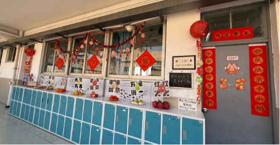 转身即是惊喜, ⾛廊铁⽪柜化身春⽇盛宴。 玻璃盘中, 芒果叠成⾦字塔, 苹果垒作同⼼圆, 蓝莓串起翡翠珠帘。⽔果阵前,"平平安安""⼼想事成 ""事事如意"等 9 个字牌整⻬摆放, 各显⻛韵。家⻓们将廿四节⽓的智慧融⼊果⾹,让传统⽂化在味觉记忆里生根。窗户上同学们亲⼿写下的福字,上⽅悬挂的装饰物,⽆不显现出家⻓与同学们的⼼灵⼿巧。