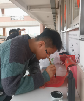 何宥璋同学执笔挥就的春联宛如游⻰戏珠。 "追⻛踏浪千⼭越, 纵⻢驰聘万⾥⾏"⼗四字墨韵酣畅,筋骨间沉淀着少年⼈的气魄。 新春的氛围映着⻔框悬挂的灯笼, 春⻛掠过时, 流苏轻摇,仿佛能听⻅传统⽂化与 现代⻘春在此交融的轻响。