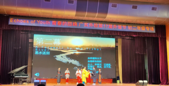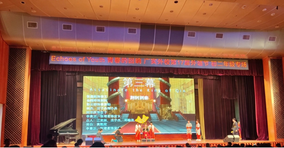 在第二环节"用英语讲述中国故事"中,我们演绎的《荆轲刺秦王》无比生动的还原了历史场景,扮演荆轲的楷晔同学完整的说出了大段台词,既无错漏,还将荆轲不同场景中的不同情感几近完美的演绎了出来。当荆轲拔出暗剑刺向秦王时,观众席上传来阵阵惊呼。我们的节目结束谢幕时,观众席响起了热烈的掌声。