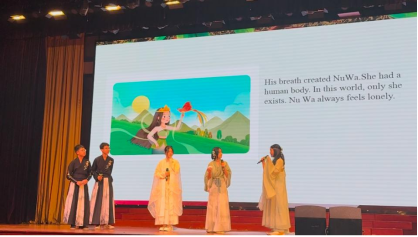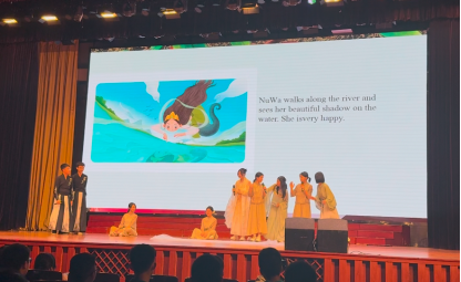 转场至《女娲造人》的创世神话时,聚光灯化作补天的五彩石倾泻而下。扮演女娲的丁愫同学身披绢帛长袍,指尖划过不存在的黄土,英语台词在唇齿间化作流淌的星河:" Divine vines for bones, heaven’s essence for souls—that’ll work!"扮演泥人的同学们用现代舞演绎着觉醒的震颤。没有奖杯的加冕反而让我们更纯粹地沉浸在跨文化对话的奇妙中——当东方创世神话披上西方语言的羽衣,竟焕发出令人战栗的新生。