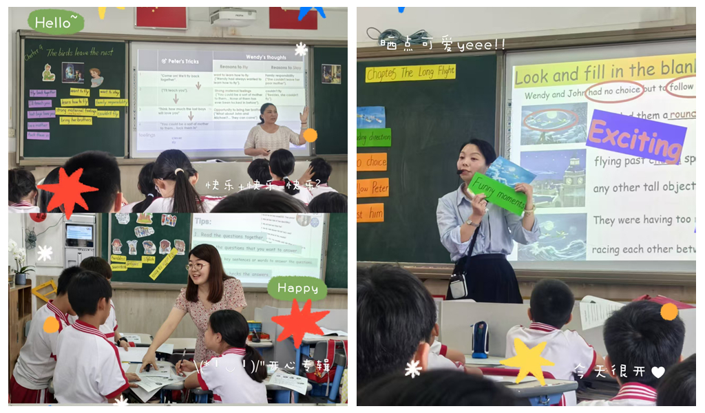 随着核心素养导向的基础教育课程改革的深化,由语言能力、文化意识、思维品质和学习能力构成的英语学科核心素养框架对中小学英语教育教学做出了新的规划,也提出了新的要求。新课标颁布后,核心素养能否落地,关键在于学校和教师的实践。本学期,小学五年级英语备课组的教研方向是Peter Pan原版英文小说的章节阅读,孩子们通过上学期阅读了黑布林简版Peter Pan的故事,已经点燃了英文小说阅读的热情,而且对故事情节有了总体的认识;与当前碎片化、拼盘式、语言有所控制的单独篇章相比,原版书所具备的高度综合性、情境性、完整性且语言真实地道的特点使其在培养学生英语核心素养方面有得天独厚的优势。但是原版书篇幅更长,缺少语言注释等辅助信息,海量的生词是孩子们阅读的拦路虎,阅读耐力差和兴趣持续困难等对小学五年级的孩子都是很大的挑战。针对以上问题,为有效开展阅读,教师们在孩子们正式开始阅读前,带领和鼓励孩子们积极查生词,根据句子的情境,选择恰当的意思,标注中文,为阅读扫清障碍;跟读原版章节的音频,感受地道的语言美,体会人物的情感变化,在阅读中精心设计丰富的课堂活动,激励孩子们参与阅读,积极思考与表达自己的感受,并且在阅读的过程中给予孩子们相应的阅读策略指导。阅读后,为孩子们设计有趣的阅读作业,延续孩子们的阅读热情,更进一步走入原版英语小说;