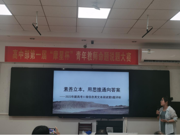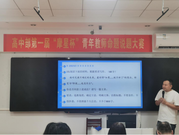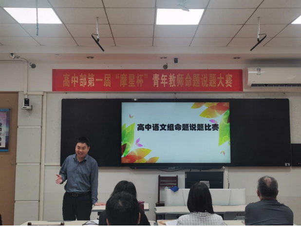 5月28日上午,高中部首届“摩星杯”青年教师命题说题大赛语文专场,在4302课室评题总结。高一团队(嘉艺、徐铭阳、高晨)与高二团队(陈磊军、郝纾晗、袁艳)聚焦新高考改革方向,分别以文言文本与作文题型为载体,展现了“命”蕴巧思,“题”升教学的命题探索。