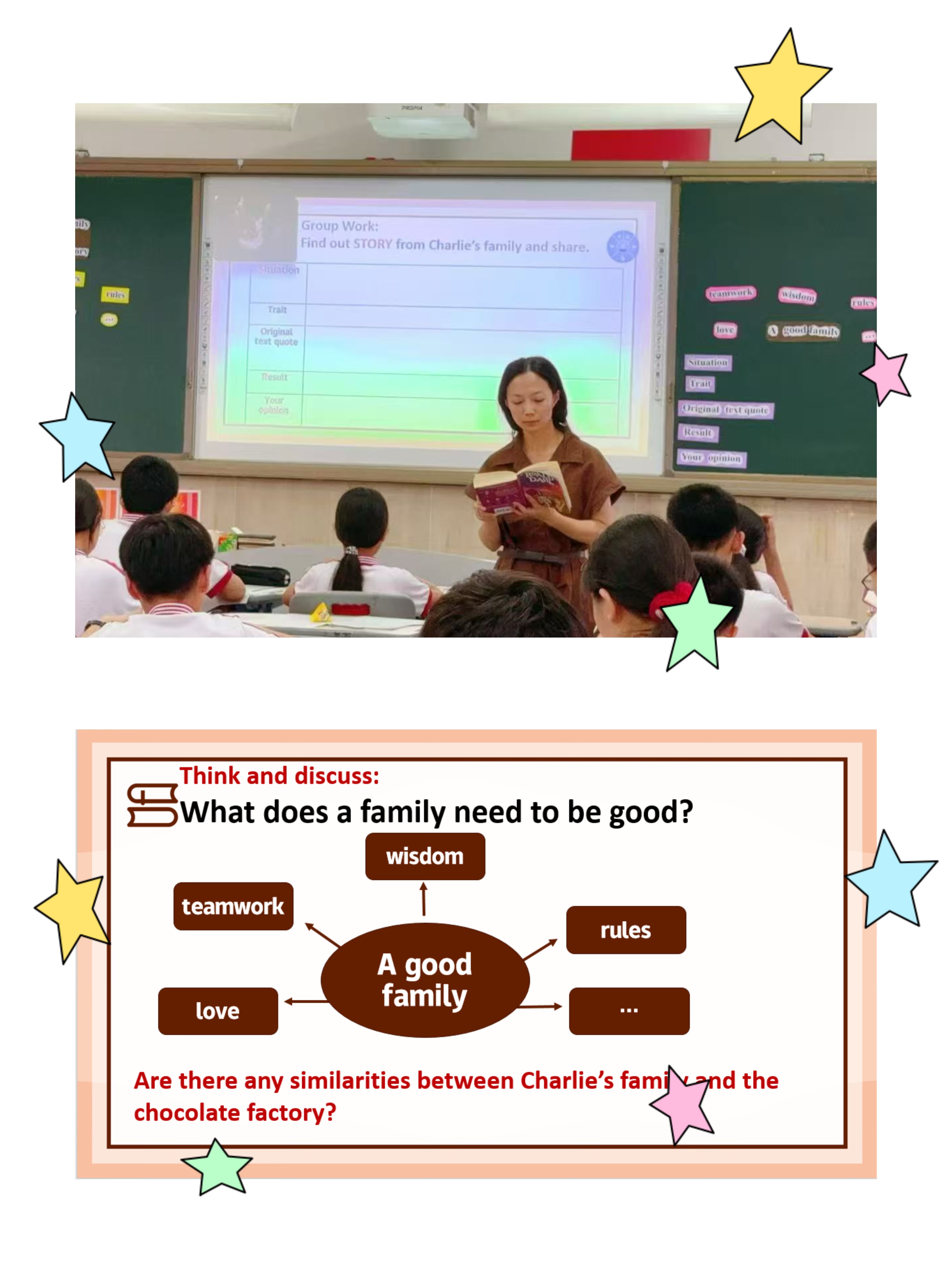 董宏老师以 “从可可豆到大树” 为隐喻主题,设计了一堂别开生面的主题式阅读与小组探究课。她巧妙地将查理的成长历程比作可可豆成长为大树的过程,通过小组探究的方式,引导学生深入挖掘文本中的成长主题和人生哲理。学生们在探究中不仅加深了对文本的理解,更在合作与分享中学会了如何面对挑战、实现自我成长。这一过程中,学生们不仅锻炼了阅读理解能力,更在思维的碰撞中实现了自我超越与成长。
