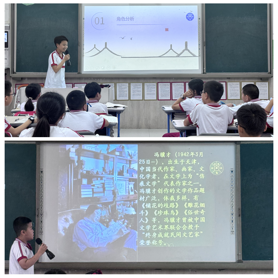 五(11)班陈翰林同学在班里分享《俗世奇人》阅读心得。他介绍了作者冯骥才,生动再现了书中精彩的场景描写和奇特的人物外貌,并深入分析了“泥人张”、“苏七块”等奇人的绝技与品格。陈同学从中提炼出核心主题:平凡人将热爱做到极致便能创造不平凡,以及不能以貌取人,传递了专注、热爱与内在美的价值。