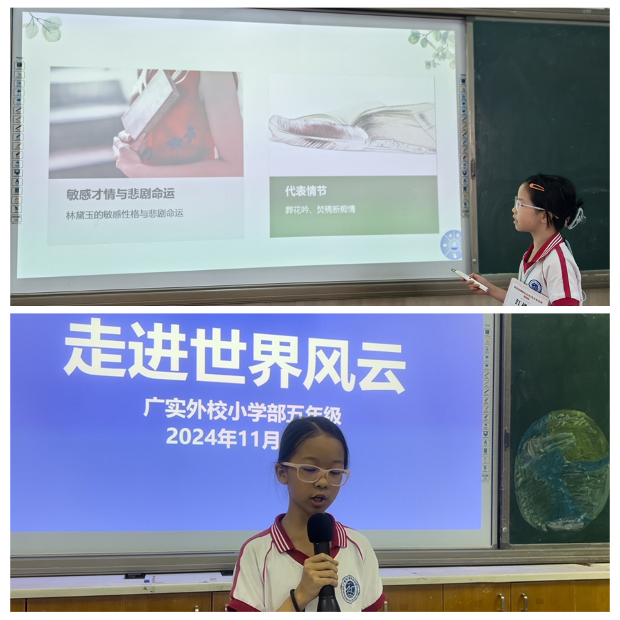五(10)班付靖雯在讲到自己读《红楼梦》时娓娓道来:这本书是著名清代小说家曹雪芹所著,与《西游记》、《水浒传》和《三国而演义》并称 “四大名著,是中华文化的瑰宝。《红楼梦》通过对“贾、史、王、薛”四大家族荣衰的描写,展示了广阔的社会生活视野,森罗万象,囊括了多姿多彩的世俗人情。全书结构新颖而奇巧,开篇就用了五个回目,以神话故事、“假语村言”掩去内容的实质,将作品置于扑朔迷离的雾色之中,借用“真”彼“观念托言梦幻”世界,使得整部小说按着这一以假寓真的结构铺陈发展,最后营造出一个"生活世界"。在《红楼梦》中,除却著名的金陵十二钗,其他有名有姓的人物就有400多个。众多的人物缤纷多姿、个性鲜明、生机勃勃 ,囊括了世间各色人等,即便在同一个人的塑造上,也是一人千面,令人叫绝。
