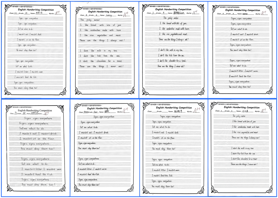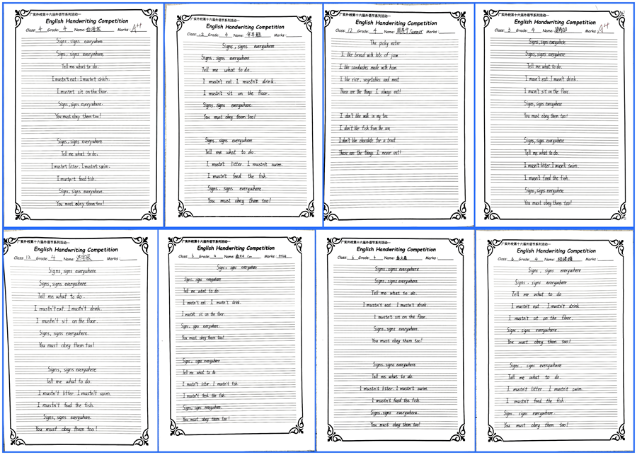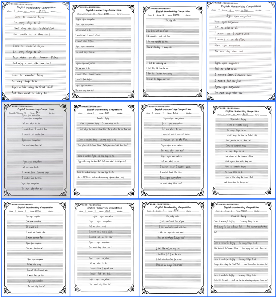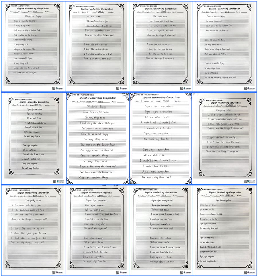 这项比赛,全体四年级学生根据要求,以严谨的态度参与这项活动,将他们喜爱的经典英文诗歌凝练于纸上。四年级的教师从字母规范、词句间距、卷面整洁度等维度对他们的作品展开评审,最终评选出优秀作品。