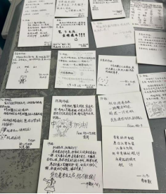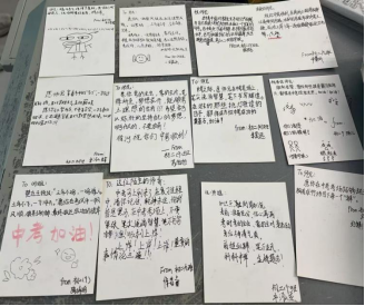 班长王俊楷打开了教室的电脑,点开了《起风了》的伴奏。动人的旋律在教室里飘荡,我们正以我们饱满的热情,积极的心态,优美的歌喉,为初三的学哥学姐们送上我们最诚挚的鼓励。教室里充满了温馨与感动,仿佛连空气都变得柔软起来。同时,一些同学在为师兄师姐们分发我们精心准备的贺卡、袜子和旺仔牛奶等小礼物。手写的明信片上写满了我们的鼓励话语,承载着我们对师兄师姐们的美好祝愿;旺仔牛奶和袜子则寓意着好运与成功。