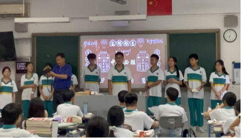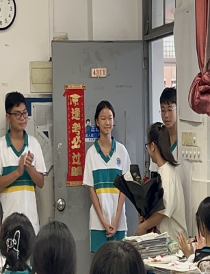 随后,我们送了一束鲜花给初三(9)班的班主任,那些挑灯夜战的日子,是罗老师一直陪伴他们努力,师兄师姐们奋勇向前的路上离不开罗老师的辛勤付出。离开时,我看见一位师兄的课桌上,旺仔牛奶和复习资料摆在一起,那个卡通头像正对着密密麻麻的笔记露出灿烂的笑容,像是对他这么久以来的努力的认可和对他未来的期待!