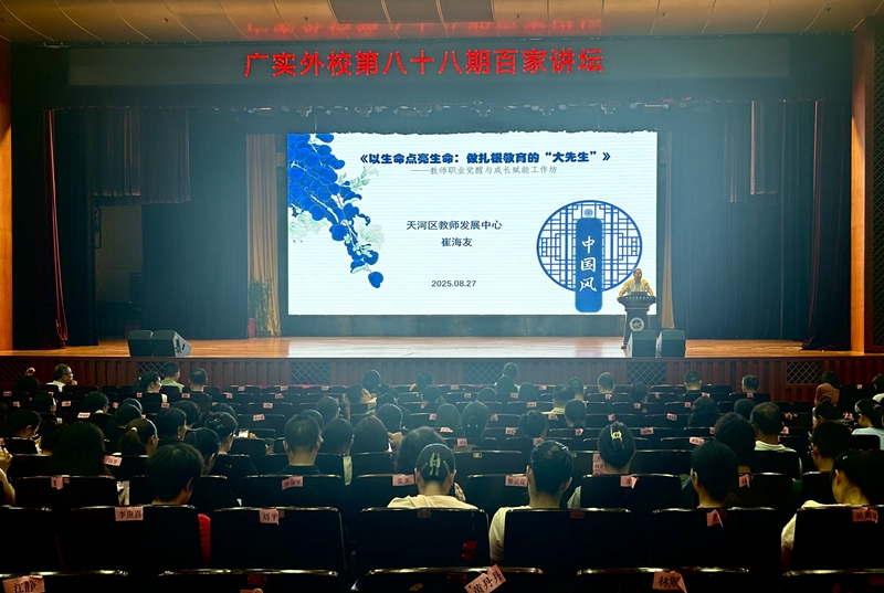 8月27日,天河区教师发展中心原主任崔海友前来我校,与老师们分享了他对教育的深刻理解与多年实践心得。崔海友以他的经历为切入点徐徐展开,向老师们生动诠释了何为扎根教育的“大先生”。