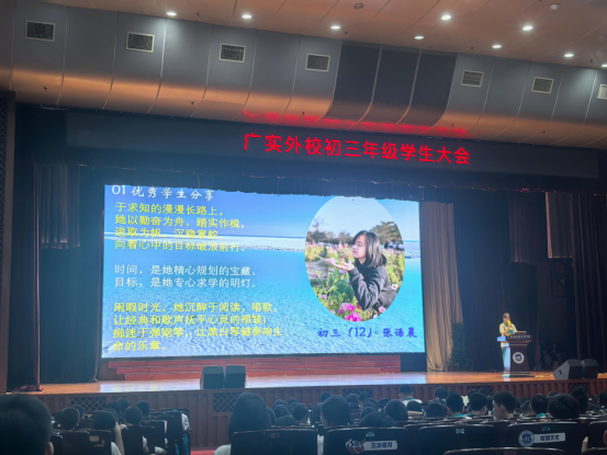 大会伊始,初三(12)班张语晨作为优秀学生代表分享经验。她以“勤奋为舟、踏实作楫、进取为帆”的学习态度,展现了对知识的热爱与规划能力,同时提及阅读、唱歌、弹钢琴等兴趣爱好,为同学们树立了“全面发展”的榜样。